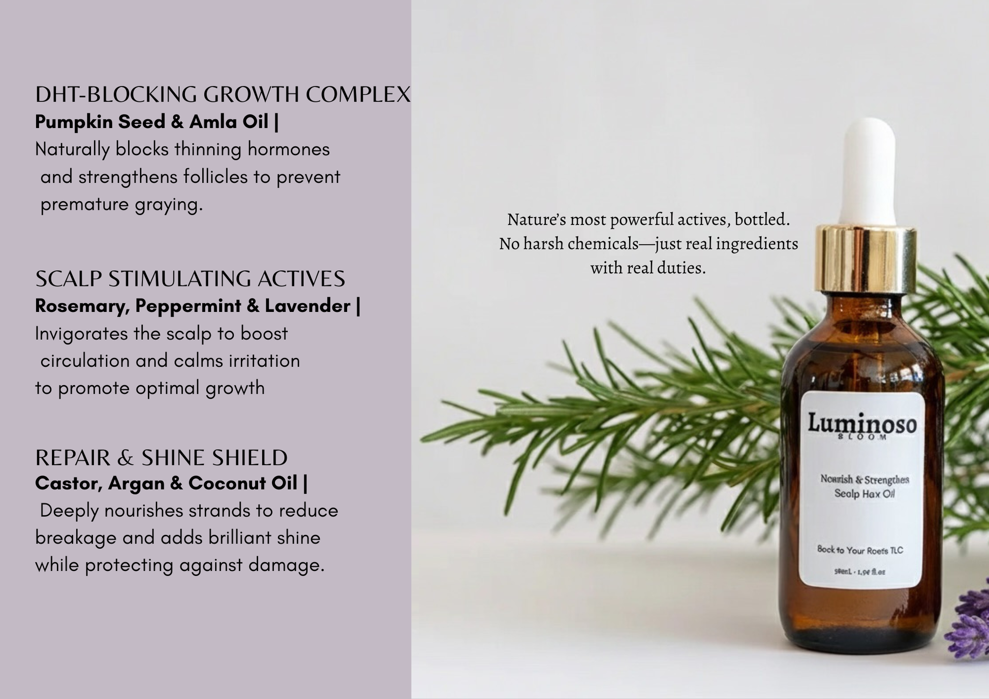 Lavender | Calms the scalp, promotes hair growth, and soothes irritation.